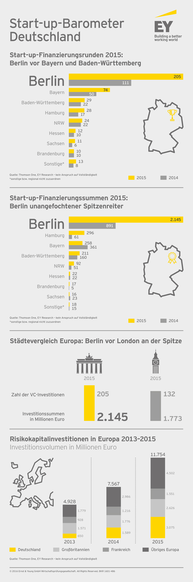 Das sind Ergebnisse des Start-up-Barometers der Prüfungs- und Beratungsgesellschaft EY (Ernst & Young). Die Studie beruht auf einer Analyse der Risikokapitalinvestitionen in Europa in den Jahren 2013 bis 2015.