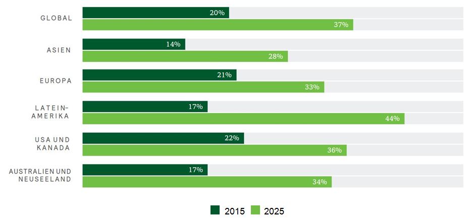 Frauen sind in den Unternehmen weltweit unterrepräsentiert. In Europa werden bis 2025 voraussichtlich nur 37 Prozent der Fach- und Managementpositionen von Frauen besetzt; dies entspricht dem Stand 2015. Im selben Zeitraum steigt der Anteil weltweit um nur 5 Prozent auf 40 Prozent.