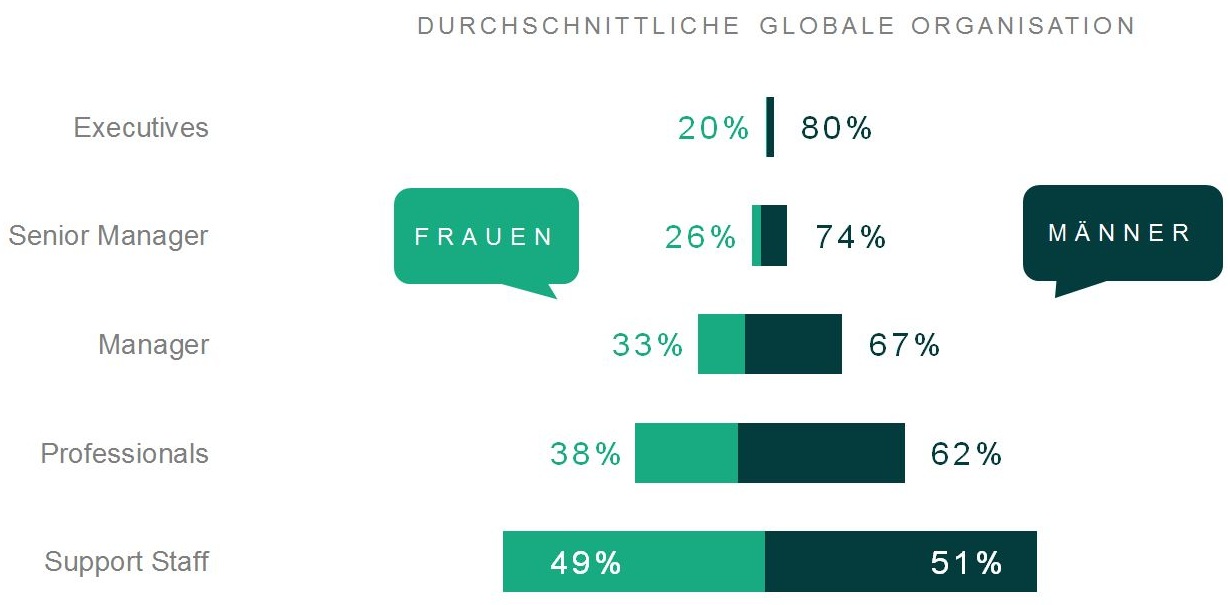 Laut Studie sind durchschnittlich 40 Prozent der Gesamtbelegschaft eines Unternehmens weiblich. Schaut man jedoch in der Hierarchie nach oben, nimmt der Frauenanteil mit jeder Stufe ab. Im Management liegt er bei 33 Prozent, im Senior Management bei 26 Prozent undauf Ebene der Executives bei 20 Prozent (vgl. Abbildung 2).