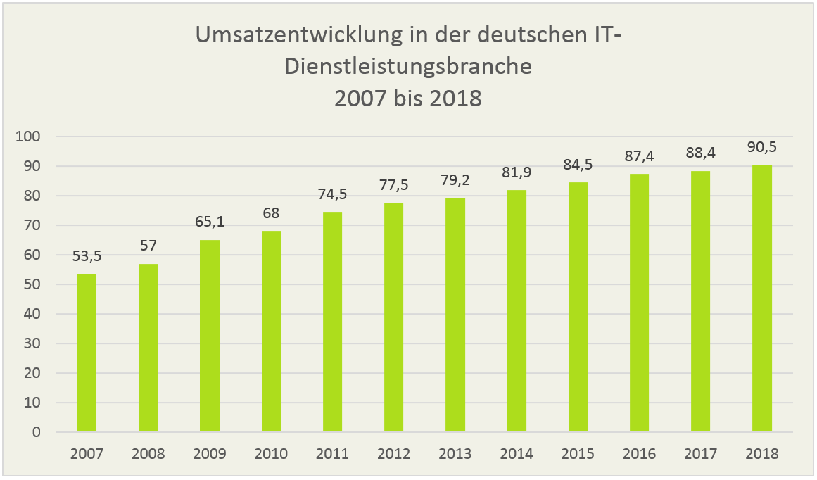 Die tatsächliche und prognostizierte Umsatzentwicklung für die IT-Dienstleistungsbranche in Deutschland, in Milliarden Euro. (Umsatz aus Lieferungen und Leistungen von Unternehmen mit einem Umsatz von mehr als 17.500 Euro; Werte für die Jahre 2015 bis 2018 beruhen auf Prognosen). Bildquelle: statista.de