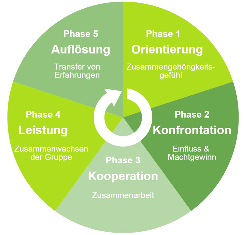 Für die Bildung einer neuen (Arbeits-)Gruppe hat der amerikanische Psychologe Bruce Tuckman sogar noch vor den Einsichten Belbins ein Modell entwickelt. In seiner ursprünglichen Form umfasste das von Tuckman dargelegte Modell vier Phasen, die er selbst im Jahr 1977 um eine fünfte ergänzte. Nach diesem Phasenmodell durchlaufen neu gebildete Gruppen folgende Entwicklungsschritte und zwar, so Tuckman, unabhängig von der Gruppengröße.