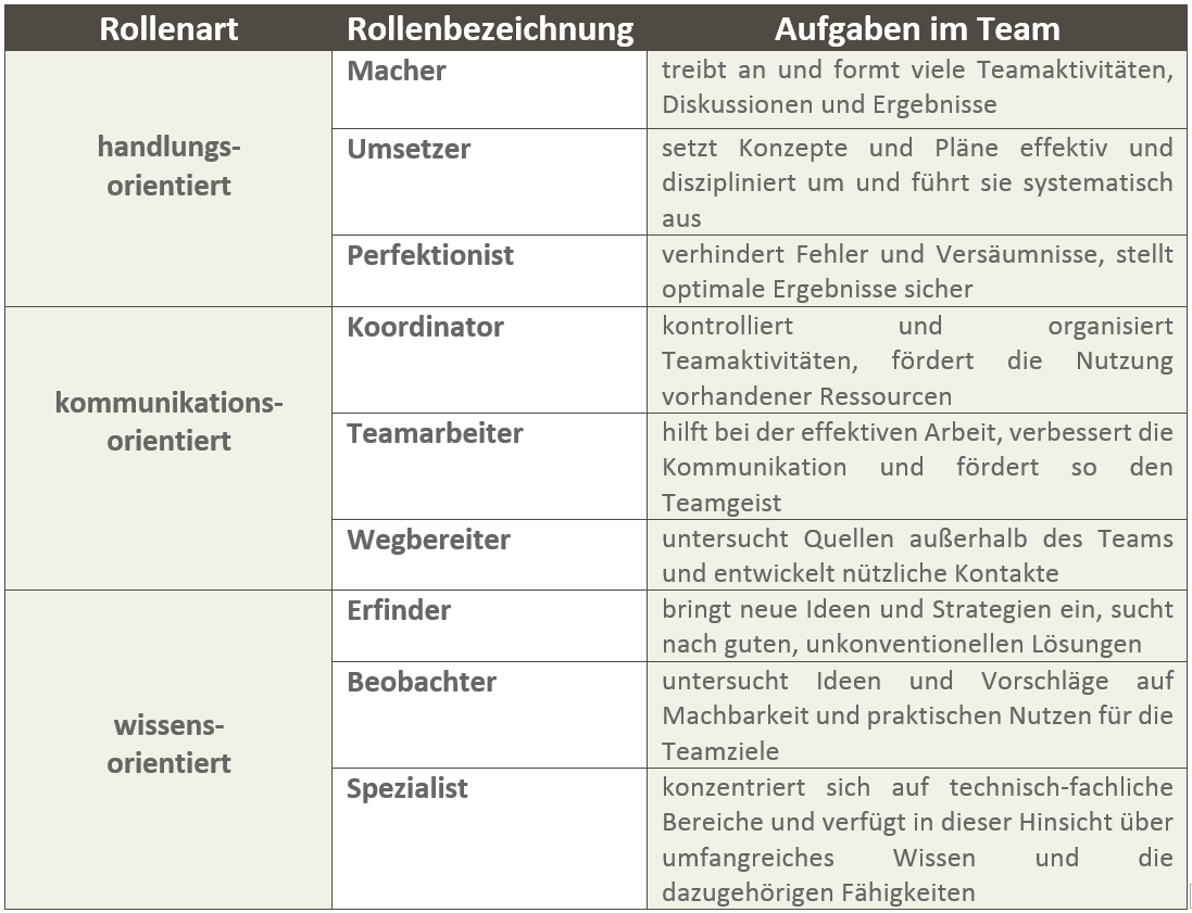Nach wie vor aktuell für das richtige Management von Teams sind die Erkenntnisse des Psychologen Raymond Meredith Belbin, die dieser bereits 1981 in seinem Buch „Management Teams: Why They Succeed or Fail“ zu Grunde legte. Ausgangspunkt für die weitere Teamentwicklung sind dabei die von Belbin beschriebenen Teamrollen, die die einzelnen Teammitglieder einnehmen. Die insgesamt neun verschiedenen Rollen sind dabei in drei unterschiedliche Kategorien eingeteilt. Daraus ergibt sich folgendes Raster: