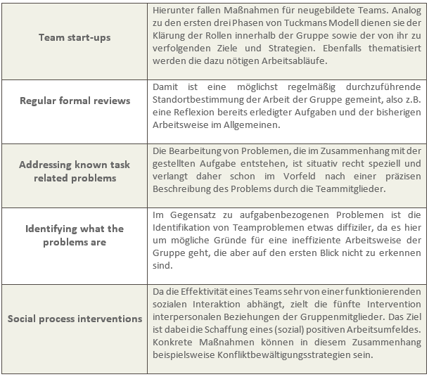 Als Ergänzung zu Tuckmans Modell können die von dem britischen Psychologieprofessors Michael West entwickelten Teaminterventionen herangezogen werden. Diese setzen, ebenso wie das Phasenmodell, an bestimmten Punkten der Gruppenfindung und –zusammenarbeit an und sollen als Hilfsmittel für die Lösung möglicher Probleme dienen. Fünf mögliche Interventionen hat West beschrieben: