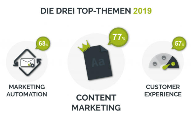 Wie auch im letzten Jahr kann sich Content Marketing als Top-Thema unter Marketern behaupten. 77 Prozent geben an, sich 2019 vor allem auf die Erstellung von relevanten Inhalten für die eigene Zielgruppe konzentrieren zu wollen. Auf dem zweiten Platz landet Marketing Automation – hier wollen 68 Prozent angreifen. Als neuer „Rising Star“ des digitalen Marketings entpuppt sich das Thema Customer Experience, welches dieses Jahr für 57 Prozent der Befragten relevant ist.
