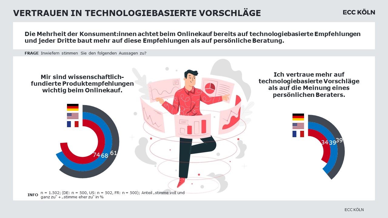 Die Auswahl passender Produkte, insbesondere bei solchen, die eine intensive Beratung erfordern, stellt Konsumenten beim Onlineshopping immer wieder vor Herausforderungen. Der Mehrheit ist daher offen für Unterstützung im Kaufprozess: Jeder dritte Konsument hat großes Vertrauen in technologiebasierte Empfehlungen beim Onlinekauf von beratungsintensiven Produkten.